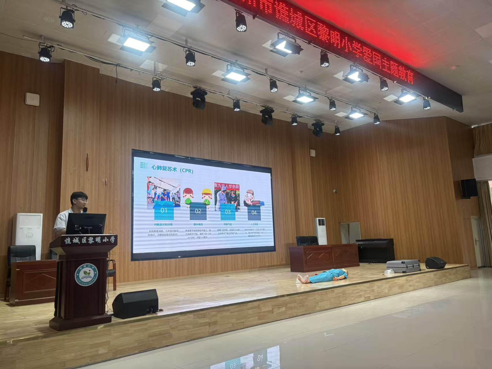在給孩子培訓后,楊偉光醫(yī)生和甘英勇護士針對異物卡喉,現(xiàn)場演示了適合幼兒的“海姆立克急救法”——雙手環(huán)抱腹部、向上快速擠壓。還邀請小朋友上臺,他們互相模擬“患者”,楊醫(yī)生手把手指導操作。遇到跌倒擦傷,醫(yī)護人員教孩子們“先清潔、再消毒、最后包扎”,并展示了繃帶和紗布的正確使用方法。最后甘英勇護士演示了現(xiàn)場的心肺復蘇的操作流程,逐步為老師和同學進行動作講解,并邀請了同學和老師進行按壓體驗?!爸笆窃谑謾C上看一些急救相關視頻及科普,現(xiàn)在親自上手進行操作感覺還是區(qū)別很大的”,幼兒園的楊老師邊記筆記邊說。
